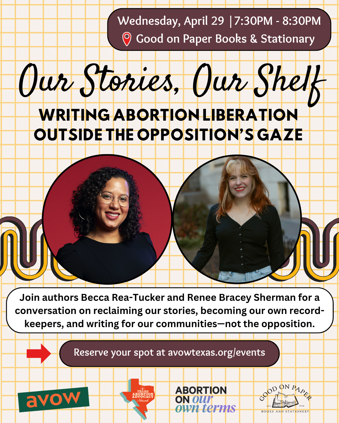 Back to All Events Houston, TX Wednesday, April 29, 2026 7:30 PM 8:30 PM Good on Paper 250 West 19th Street Houston, TX, 77008 United States (map) Google Calendar ICS Renee Bracey Sherman will be in conversation with Becca Rea Tucker and Avow at Good on Paper in Houston, Texas. The event is co-sponsored by the Texas Abortion Advocacy Network and Abortion On Our Own Terms. RSVP